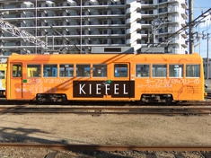 阪堺電車は上り下りの双方向で約6分刻みで運行しています。各種の車輌が走る中でキーフェルの広告電車は351形の車輌です。一日に何度か往復しますから、その間に見ることができます。オレンジカラーのイキイキした色は見る人に活力を与えてくれます。躍動感があり、歓喜と生命感あふれるこの色は正にラッキーカラーとも言えるでしょう。見ることができたらラッキーかも知れませんよ。